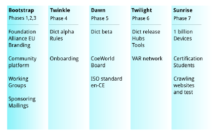 The seventh phase, where the dictionary gets rolled out to devices, where VAPs and teachers can start to teach the Colish way of spelling and organisations can use, for the first time, a world wide supported Common English dictionary.